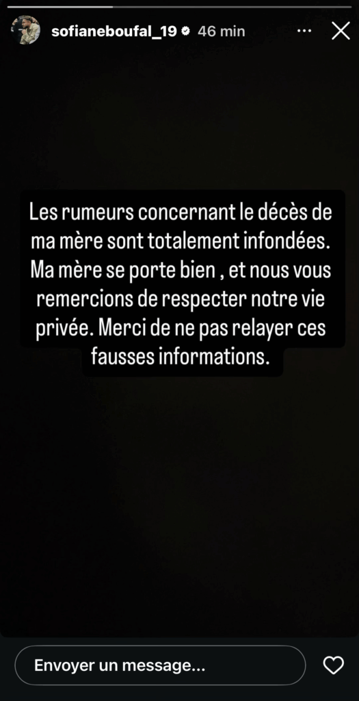 ونشر بوفال عبر الإنستغرام: “الشائعات التي تتحدث عن وفاة والدتي لا أساس لها من الصحة، والدتي بصحة جيدة، ونحن نشكر الجميع على احترام حياتنا الخاصة، ونطلب منكم عدم إعادة نشر هذه المعلومات الكاذبة.”