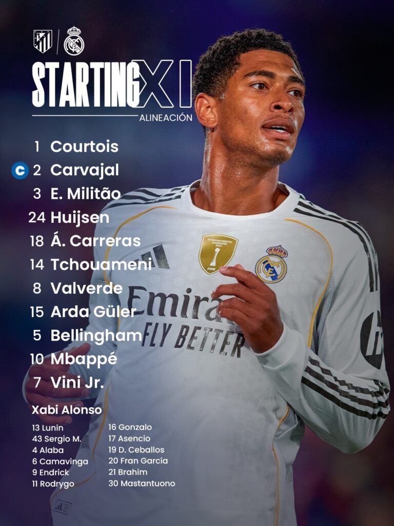 وشهدت قائمة النادي الملكي لمواجهة القمة اليوم غياب عدة أسماء بارزة، في مقدمتها الظهير الإنجليزي ألكساندر أرنولد والمدافع الألماني أنطونيو روديغر، إلى جانب الظهير الأيسر فيرلان ميندي، وذلك بسبب معاناتهم من إصابات متفاوتة.