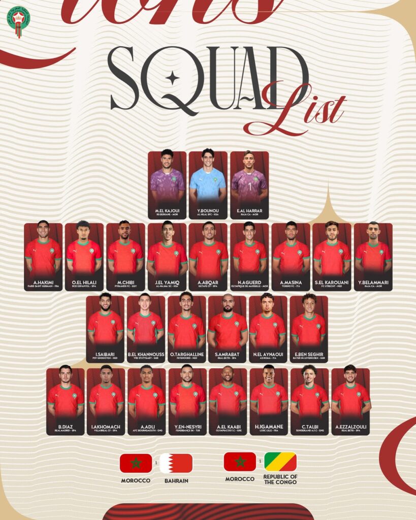 أعلن الناخب الوطني وليد الركراكي، صباح الخميس، عن اللائحة الرسمية للمنتخب الوطني المغربي الأول، استعدادا للمباراتين الوديتين أمام منتخبي البحرين والكونغو برازافيل، المقررتين يومي 9 و14 أكتوبر الجاري على أرضية ملعبرالأمير مولاي عبد الله بالرباط، انطلاقا من الساعة الثامنة مساء، وجاء هذا الإعلان خلال الندوة الصحفية التي عقدها الركراكي بمركز محمد السادس لكرة القدم.