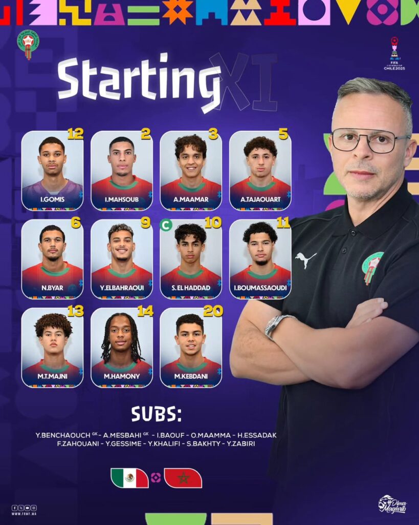 أعلن الناخب الوطني محمد وهبي عن التشكيلة الرسمية للمنتخب الوطني المغربي لأقل من 20 سنة، لمواجهة المنتخب المكسيكي، عند الساعة التاسعة من مساء اليوم السبت، برسم الجولة الثالثة من دور المجموعات لنهائيات كأس العالم للشباب، التي تحتضنها الشيلي.