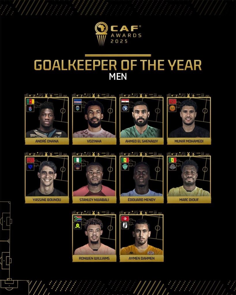 وعلى صعيد حراس المرمى، يتنافس الدوليان المغربيان ياسين بونو ومنير المحمدي على جائزة أفضل حارس إفريقي، وجاء اختيار بونو بعد أن احتل المركز الخامس في جائزة ياشين لافضل حارس في العالم، ووصوله إلى ربع نهائي كأس العالم للأندية مع ناديه الهلال السعودي، فيما توج المحمدي مع نهضة بركان بالدوري المغربي وكأس الكونفيدرالية الإفريقية، ليكونا أبرز الحراس الأفارقة هذا العام.
