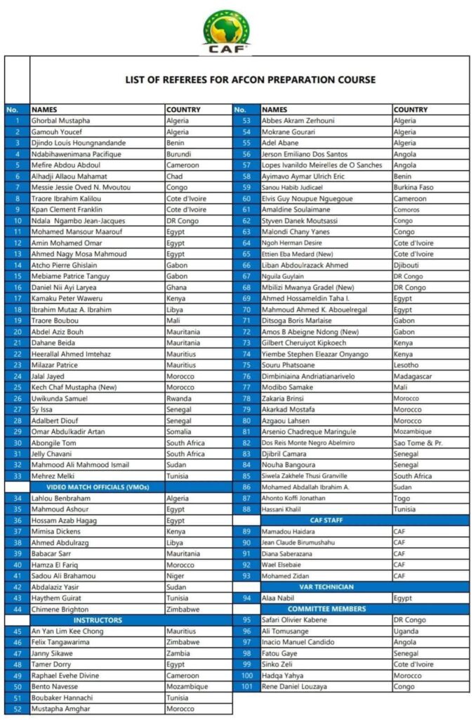 وستعرف اللائحة تقليصا عند الوصول للقائمة النهائية قبل انطلاق البطولة، حيث سيتم اختيار الحكام الأكثر جاهزية وكفاءة لإدارة مباريات كأس الأمم الإفريقية، المقررة إقامتها في 21 من شهر دجنبر القادم والى غاية 18 من شهر يناير لعام 2026 بالأراضي المغربية.