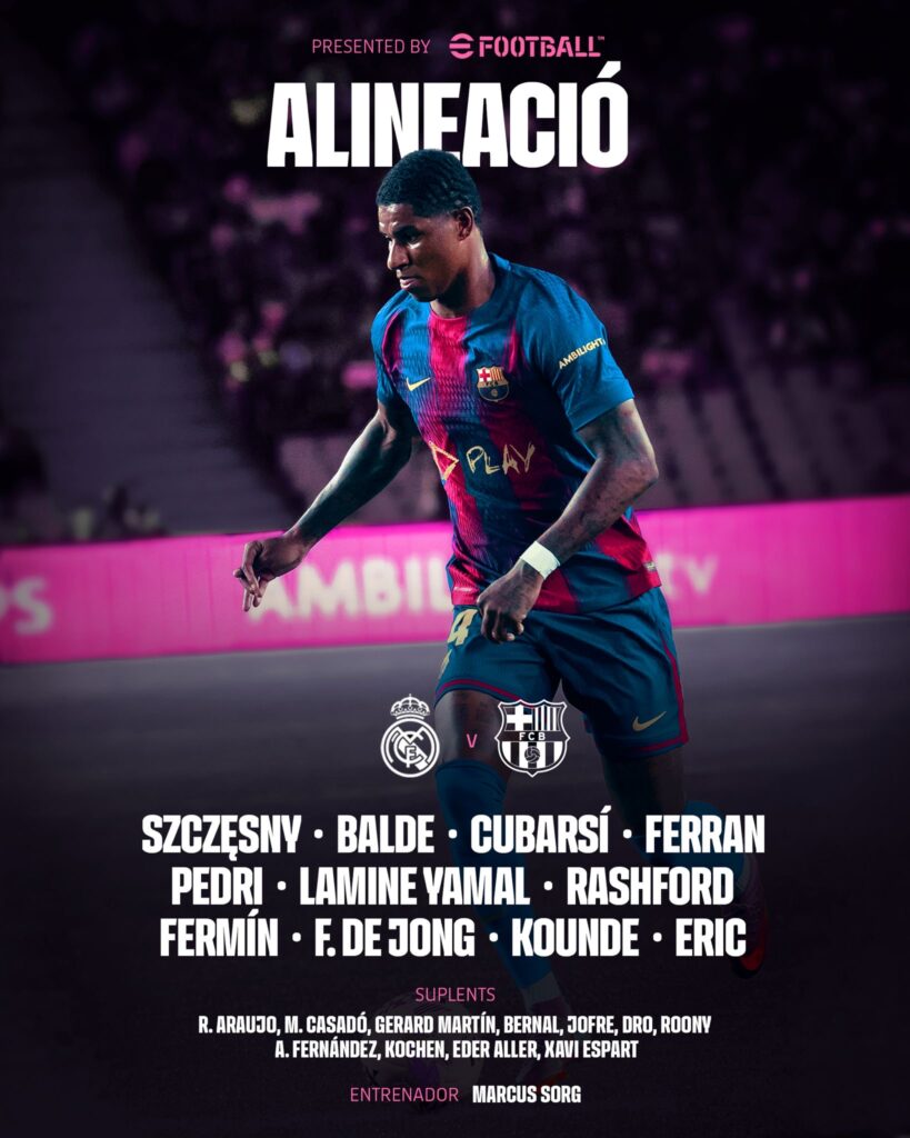 من جانبه، أعلن المدرب الألماني هانزي فليك عن تشكيلة برشلونة الأساسية في هذه القمة، معتمدا على مزيج من الخبرة ومهارة الشباب بقيادة يامال، لاسيما مع الغيابات التي يعاني منها فريقه ابرزها ليفاندوفسكي وزميله رافينا.