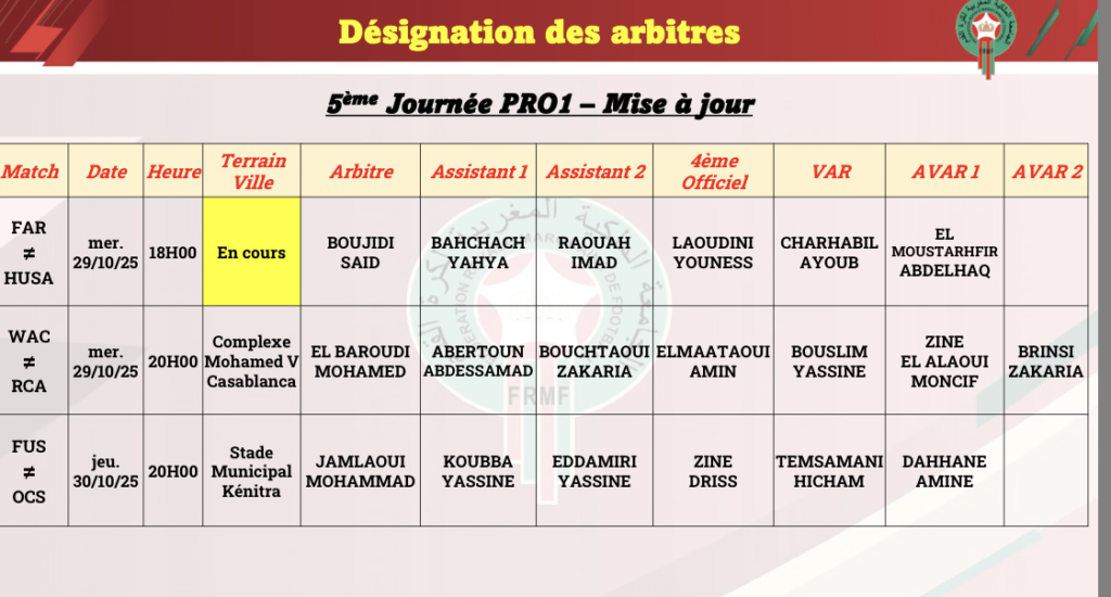 وسيقود مباراة الفتح الرباطي ضد أولمبيك آسفي، الحكم محمد الجملاوي، بمساعدة هشام التمسماني في غرفة الفار، وستقام يوم الخميس الساعة الثامنة مساء بالملعب البلدي بالقنيطرة.
