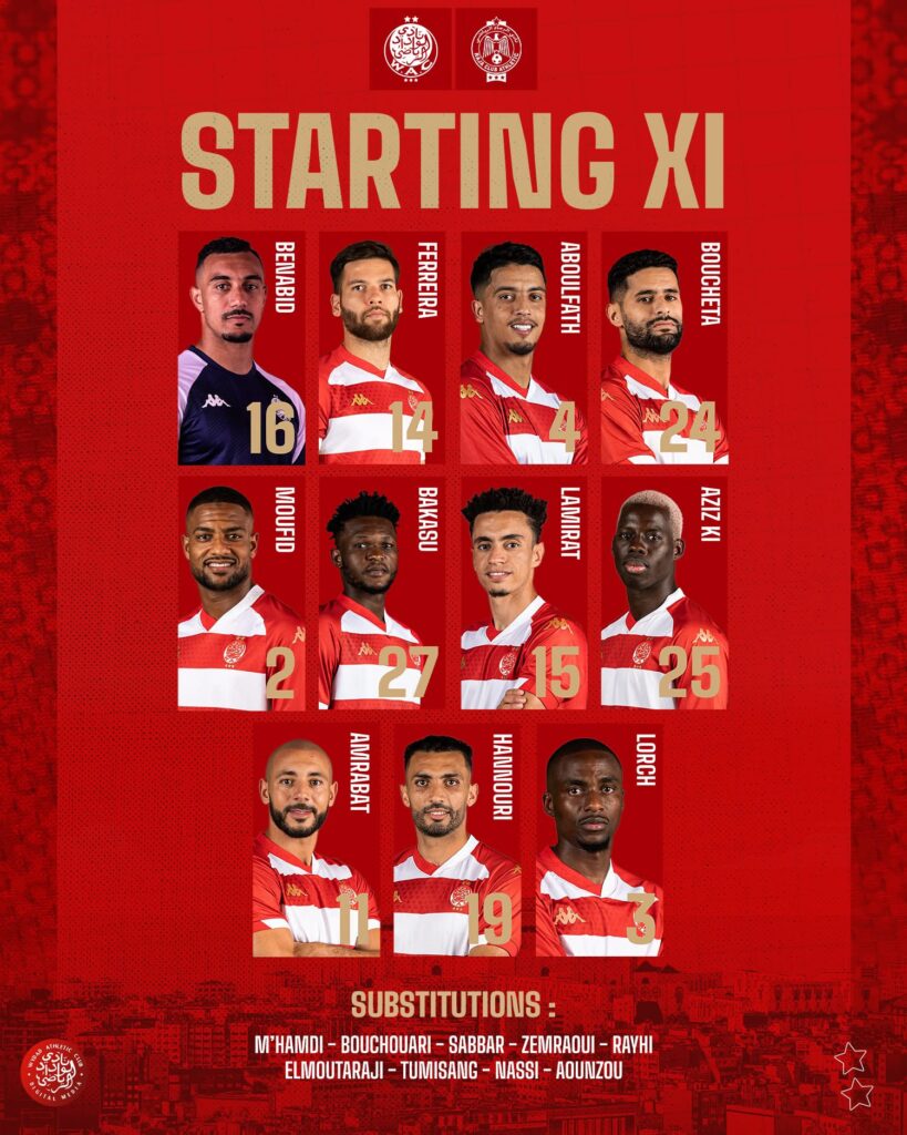 أعلن المدير الفني لنادي الوداد الرياضي، محمد أمين بنهاشم، عن التشكيلة الأساسية للفريق الأحمر والتي ستخوض مساء اليوم الأربعاء مباراة الديربي أمام الرجاء الرياضي، بداية من الساعة الثامنة، على أرضية المركب الرياضي محمد الخامس بالدار البيضاء، وذلك ضمن مؤجل الجولة الخامسة للبطولة الاحترافية.
