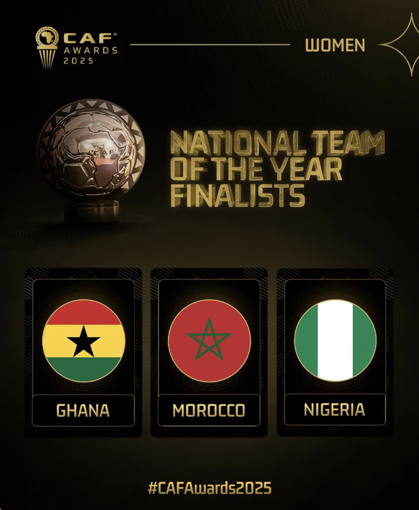 وضمت القائمة النهائية لافضل منتخب نسوي، المنتخب الوطني المغربي النسوي، الذي وصل إلى نهائي كأس أمم إفريقيا للسيدات التي احتضنتها المغرب هذا العام، إلى جانب كل من نيجيريا حاملة لقب المسابقة وغانا.