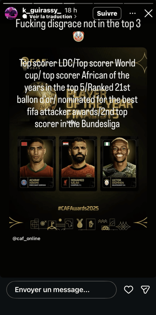 وتفاعل شقيق غيراسي ووكيل أعماله، مع الخبر عبر حسابه الرسمي على موقع إنستغرام، حيث نشر رسالة عبر ستوري عبر فيها عن استيائه الشديد لقرار اللجنة المنظمة، وكتب: “عار أن لا يتواجد ضمن أفضل 3 لاعبين في إفريقيا”.