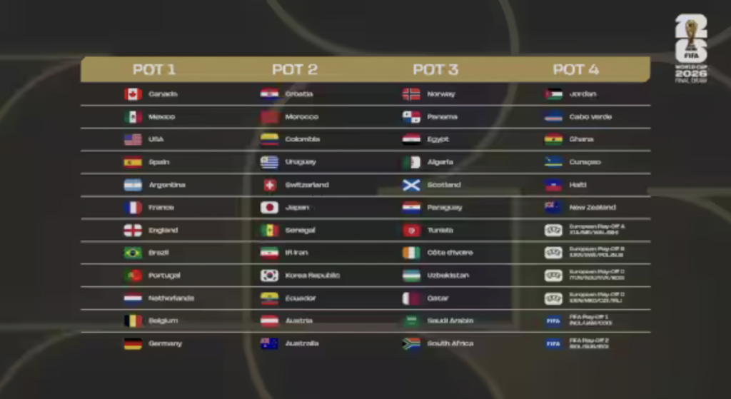 وتضمنت إجراءات القرعة توزيع المنتخبات على أربعة أوعية، حيث وضعت المنتخبات المستضيفة للبطولة (كندا والمكسيك والولايات المتحدة الأمريكية) في الوعاء الأول، إلى جانب تسعة منتخبات كبرى وفق التصنيف العالمي للرجال، الصادر في 19 نونبر الماضي، وسيتم سحب منتخبات الوعاء الأول أولا لتوضع على رؤوس المجموعات 12، مع اعتماد كرات ملونة لتمييز البلدان المستضيفة.