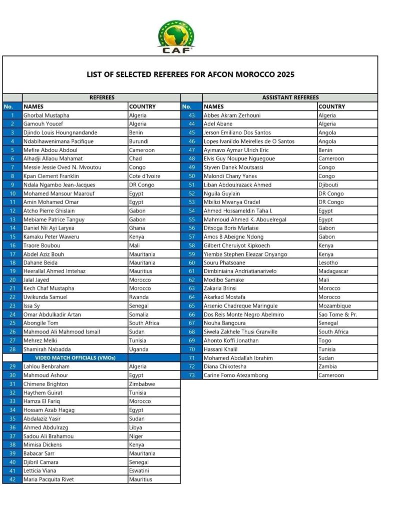 كشف الاتحاد الإفريقي لكرة القدم، عن القائمة النهائية للحكام الذين سيقودون مباريات نهائيات كأس الأمم الإفريقية 2025، المقررة بالمغرب ما بين 21 دجنبر 2025 و18 يناير 2026، والتي ضمت 75 حكما من مختلف الدول الإفريقية، من بينهم خمسة حكام مغاربة.