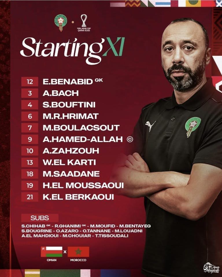 أعلن الناخب الوطني طارق السكتيوي، عن التشكيلة الأساسية للمنتخب الوطني الرديف، التي ستواجه منتخب عمان عصر اليوم الجمعة، ابتداء من الساعة الثالثة والنصف، ضمن الجولة الثانية من منافسات المجموعة الثانية، في بطولة كأس العرب قطر 2025، على أرضية ملعب المدينة التعليمية بالدوحة.