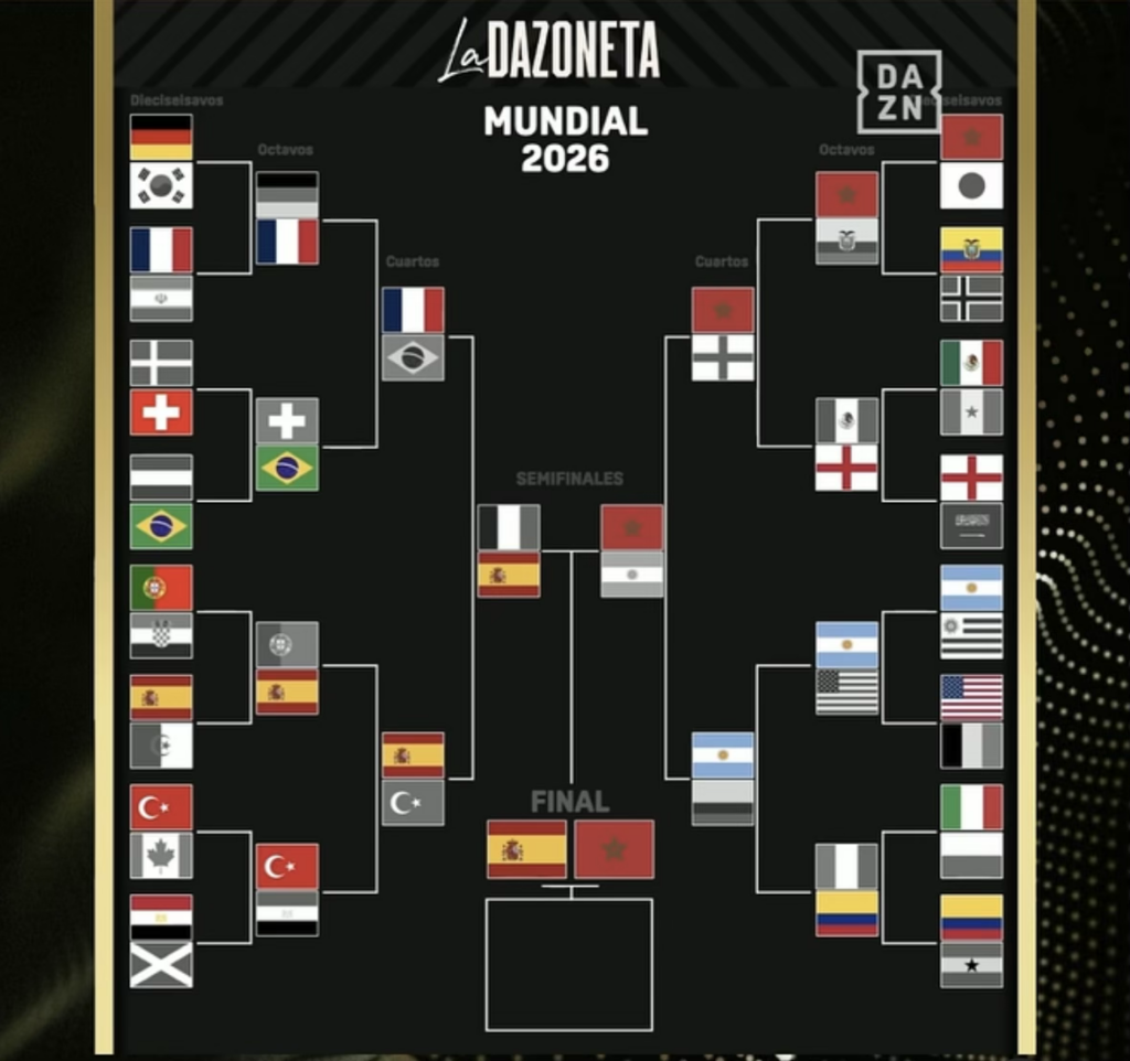 تواصل وسائل الإعلام الرياضية في إسبانيا، إشادتها بالمنتخب الوطني المغربي، وهذه المرة عبر توقع جريء وضع أسود الأطلس في نهائي كأس العالم 2026، وفق المسار الذي رسمته منصة “DAZN” في تحليلها لمسار المنتخبات المرشحة للذهاب بعيدا في البطولة، والتي ستقام بأميركا وكندا والمكسيك.