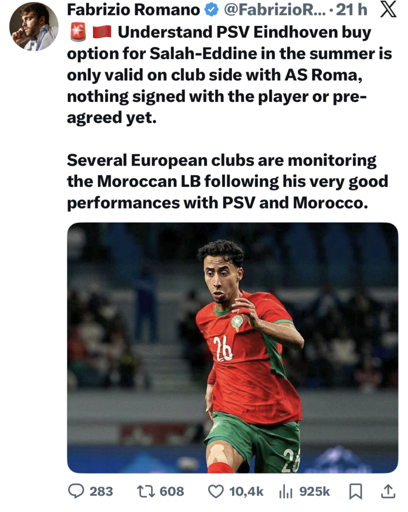وأوضح رومانو أن عدة أندية أوروبية تتابع عن كثب وضعية صلاح الدين، في ظل المستويات القوية التي بصم عليها هذا الموسم رفقة بي إس في، إلى جانب تألقه اللافت مع المنتخب الوطني المغربي.