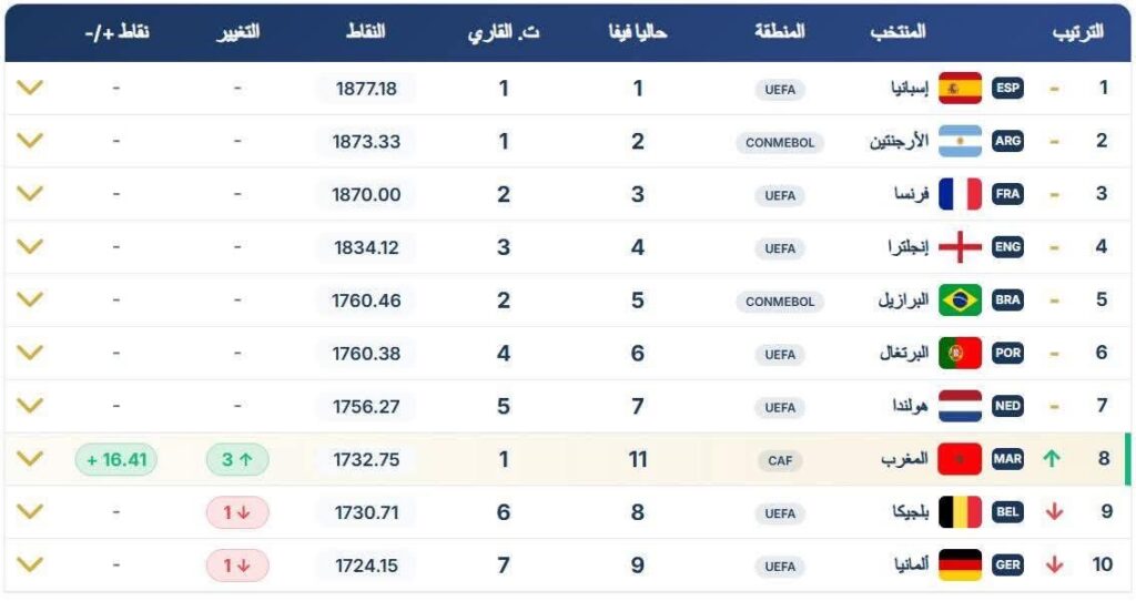 وقبل مواجهة منتخب الكاميرون، التي جرت مساء أمس ضمن ربع نهائي كأس الأمم الإفريقية، كان المنتخب المغربي يحتل المركز العاشر عالميا برصيد 1.721,33 نقطة، غير أن الانتصار المحقق مكنه من إضافة 11,42 نقطة، ليرتفع رصيده الإجمالي إلى 1.732,75 نقطة، وهو ما أهله لاحتلال المركز الثامن، متقدما على منتخب بلجيكا الذي يتوفر على 1.730,71 نقطة.