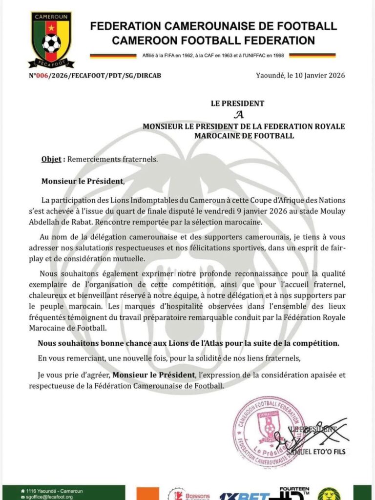 وجه صامويل إيتو، رئيس الاتحاد الكاميروني لكرة القدم، مراسلة رسمية إلى فوزي لقجع، رئيس الجامعة الملكية المغربية لكرة القدم، عبر من خلالها عن تهانيه الخالصة للمملكة المغربية على التنظيم المحكم لنهائيات كأس الأمم الإفريقية 2025.