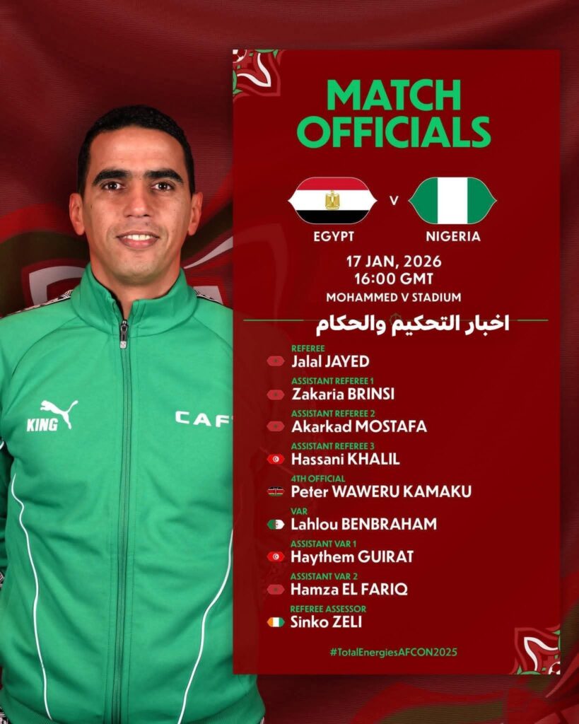 أعلن الإتحاد الأفريقي لكرة القدم، عن تعيين طاقم تحكيمي مغربي لقيادة القمة المرتقبة التي ستجمع بين منتخبي مصر ونيجيريا، برسم مباراة تحديد المركز الثالث ضمن منافسات كأس الأمم الإفريقية المغرب 2025.