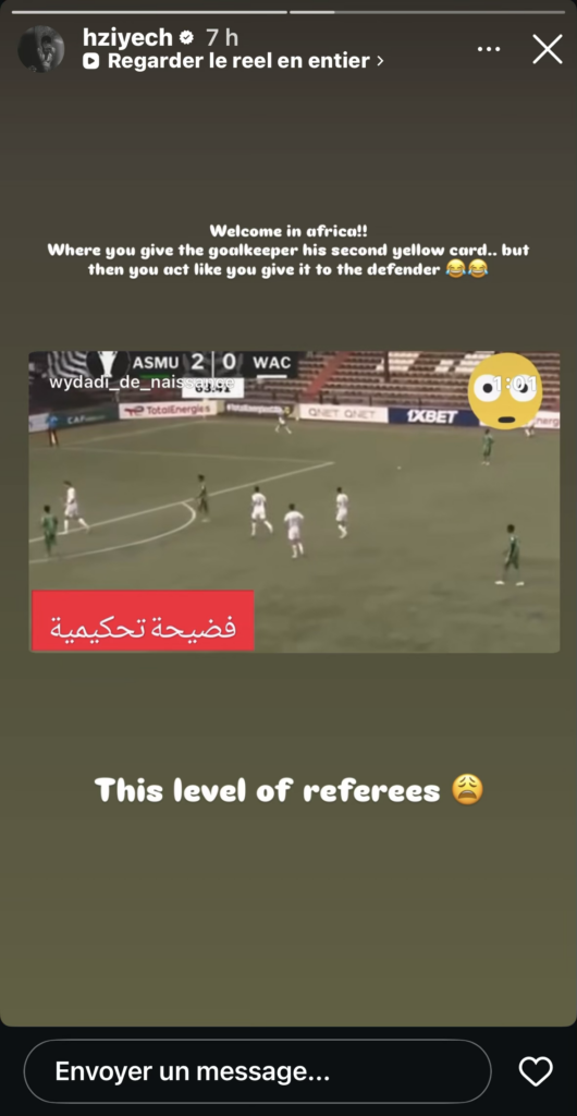 ولم يتوقف الجدل عند حدود المستطيل الأخضر، إذ تفاعل الدولي المغربي حكيم زياش نجم الوداد مع الواقعة، من خلال نشره مقطع فيديو للقطة عبر خاصية الستوري بحسابه الرسمي على إنستغرام، أرفقه بتعليق ساخر جاء فيه: “مرحبا في إفريقيا، حين تمنح الحارس الإنذار الثاني، لكن تتصرف وكأنك منحته للمدافع، يا له من مستوى تحكيمي”.